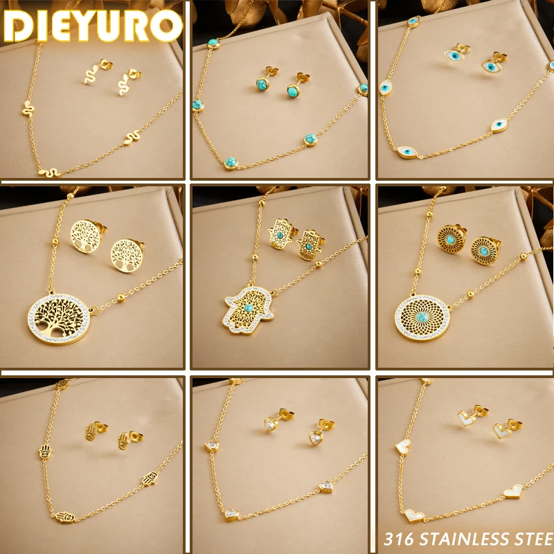 طقم قلادة وأقراط للنساء ، شجرة الحياة ، الفيروز ، المجوهرات الذهبية ، 316L الفولاذ المقاوم للصدأ ، هدية الحفلات ، الموضة ، جديد ،
